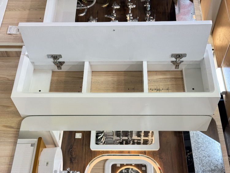 این مدل روشویی با تفکیک بهینه فضای کابینت که 2 عدد کشو برای لوازم بهداشتی کوچک و یک کمد بزرگ برای لوازم بهداشتی بزرگتر بهترین و کاربردی ترین کابینت روشویی را ایجاد کرده است