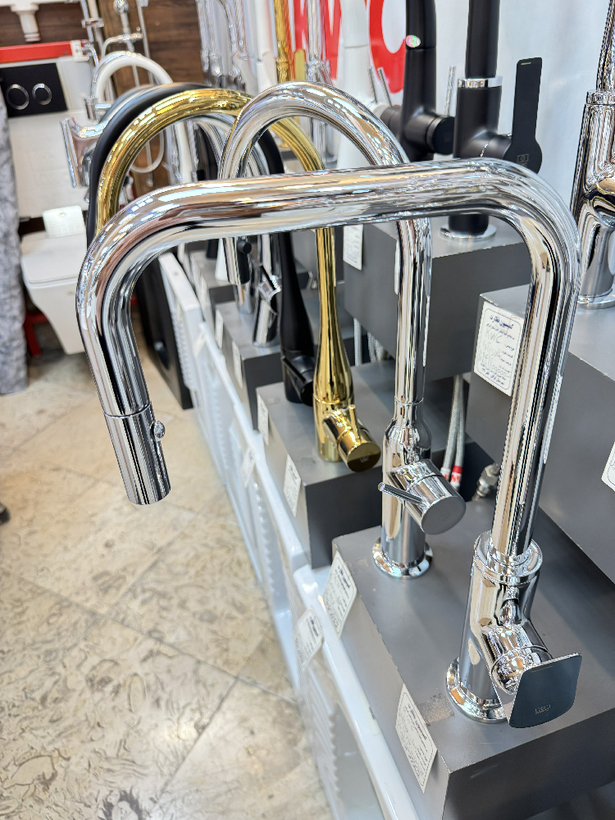 علم ظرفشویی بلند و کشیده با دو خم 90 درجه در علم ظرفشویی که این طراحی برای شستشوی ظروف بزرگ کمک میکند که ظروف دیگر به زیر علم شیر برخورد نکنند و به راحتی ظروف را زیر شیر بتوانید بچرخانید