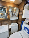 در قسمت بالای روشویی یک آینه کابین که آینه باز شونده با فضای بزرگ برای لوازم آرایشی و بهداشتی تعبیه شده